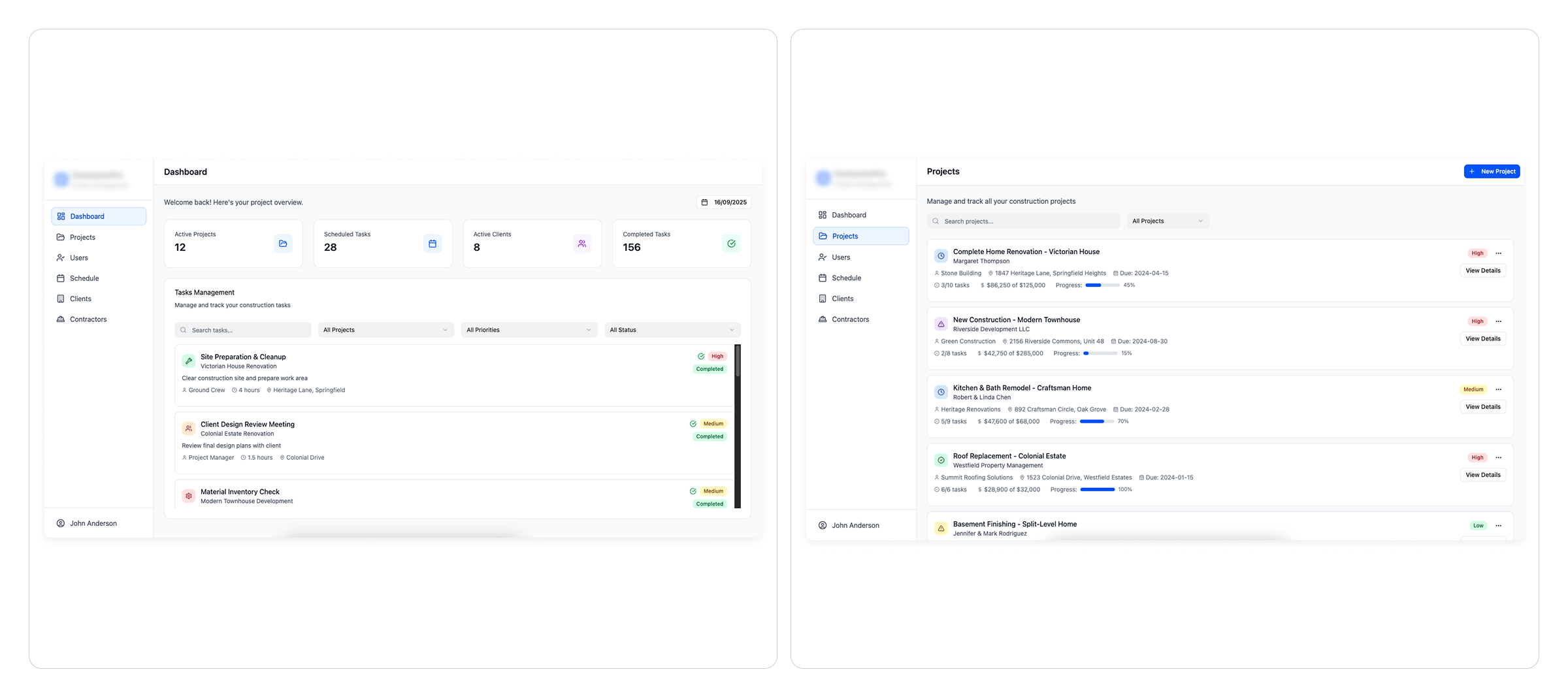 - Modular web app with sections for Projects, Clients, and Contractors